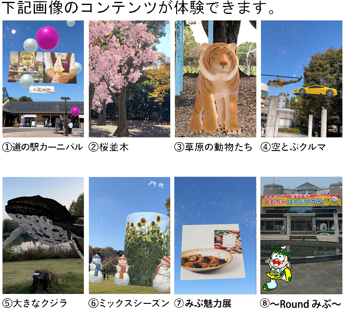 ※コンテンツの①~⑧と体験できる場所の①~⑧はリンクしています。(例:コンテンツ①道の駅カーニバルは体験できる場所①にて体験できます。)