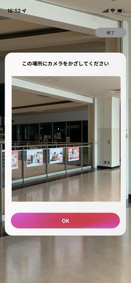 各コンテンツの「PLAY」ボタンをタップした後に表示される、風景写真が目印となります。「PLAY」ボタン押下後に、同様の風景になるようにカメラをかざしていただくと、コンテンツが開始されます。